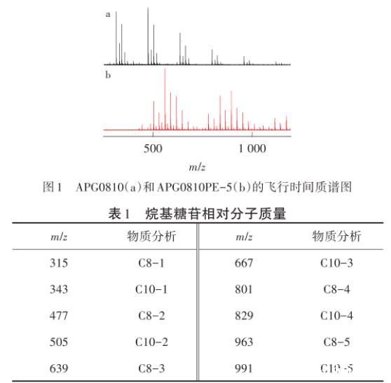 由图1可以看出,m/z315表示单糖苷的C8烷基糖苷,m/z343表示单糖苷的C10烷基糖苷,m/z477与m/z315相差M(162),162表示一个葡萄糖脱掉一个水的相对分子质量,APG0810的分子质量组成分析如表1所示。