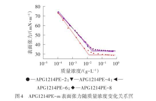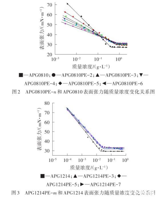 平衡表面张力揭示了表面活性剂降低溶剂(通常是水)表面张力的能力。表面活性剂的许多应用都与平衡表面张力有关,例如起泡作用、润湿作用、铺展作用等。图2为APG0810PE-n和APG0810平衡表面张力随着质量浓度变化的关系图,图3、图4为APG1214PE-m和APG1214平衡表面张力随着质量浓度变化的关系图,相应的物化性能参数列于表3。