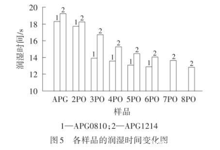 由图5可以看出,APG0810PE-n和APG1214PEm的润湿时间随着PO加合数的增加而减少。这是因为表面活性剂在湿润帆布片时,PO基团的引入为分子提供疏水性,提高了分子与帆布片之间的疏水相互作用,促使分子易于吸附在帆布片表面,有利于润湿。而APG1214和APG1214PE-m的润湿时间比APG0810和APG0810PE-n长,说明随着碳链增长,润湿性能变差,这是因为分子长度增加打破了亲水亲油平衡状态,不利于润湿。