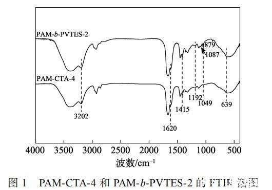 图1为聚合物的FTIR谱图。由图1可知,对于PAM-CTA-4,3202 cm–1处为—NH2的伸缩振动吸收峰,1620 cm–1处为C==O键的伸缩振动吸收峰,1192 cm–1处的吸收峰为C—S键的伸缩振动,1049 cm–1处的吸收峰为C==S键的伸缩振动,1415 cm–1处的吸收峰归属于苯环骨架的伸缩振动,639 cm–1处的吸收峰为苯环上单取代的特征峰,表明聚合物PAM-CTA-4已经成功制备。在PAM-b-PVTES-2的FTIR谱图中,879 cm–1处为Si—C键的伸缩振动吸收峰,1087 cm–1处为Si—O键的伸缩振动吸收峰,表明聚合物已成功制备。