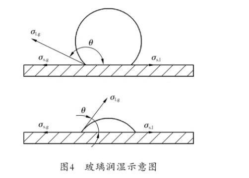 图4为玻璃润湿示意图。如果液体(熔体)和固体间的表面张力很大时,趋向于收缩成球状以减少两相界面,润湿角q也较大,q>90°,称为液相不润湿固相;q<90°,称为液相润湿固相。