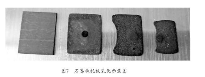 石墨在高温下易氧化,如图7所示,氧化会破坏高纯石墨承托板的表面平整度,影响玻璃熔体成球形状,进而影响玻璃液滴体积测量,最终导致表面张力测量误差。为了避免高纯石墨承托板氧化以及玻璃试样在高温熔融状态下氧化的问题,须在试样放进加热炉前通入保护气,因为非极性分子对玻璃熔体表面张力的影响最小,非极性分子有氮气、氦气、氢气等,而氮气廉价且易得,选用氮气作保护气。考虑到炉管直径与体积,转子流量计设置为1~3 L/min,大致能够满足每分钟3~10倍的气体置换,使炉内形成正压,氧气不会渗入炉内,防止石墨承托板氧化,保护气体充满整个加热炉的同时不会气流过大,将试样吹落。