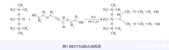 丁炔二醇乙氧基化物(BEO)分子结构中含有炔基和两个醇羟基,具有低泡和润湿性好的优点,在涂料工业中可配合三硅氧烷表面活性剂作为润湿剂和流平剂。由于BEO分子中具有不饱和的炔基,可与七甲基三硅氧烷及含氢聚硅氧烷发生硅氢加成反应,合成具有两条亲水基团的有机硅表面活性剂。所得产物结合了有机硅表面活性剂和炔二醇表面活性剂的优点,在消泡性、润湿性、耐水解性方面更有优势,近年来逐渐受到研究者的关注。