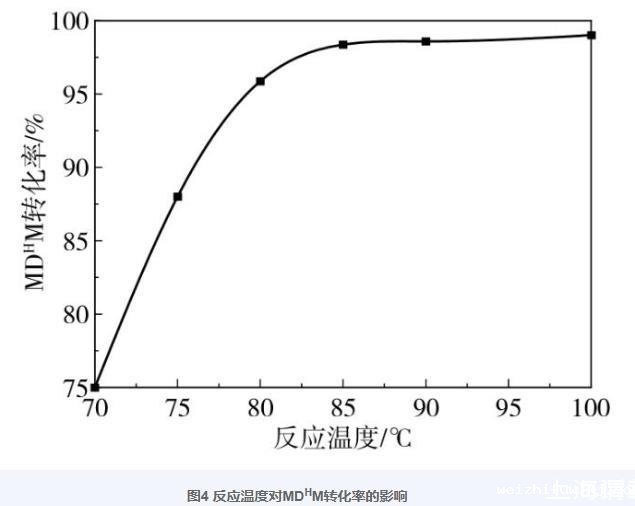 在n(BEO)∶n(MDHM)=1.05∶1、反应时间6.0 h、反应温度100℃的条件下,考察三氯化钌催化剂用量对MDHM转化率的影响,结果如图2所示。可以看出,随着催化剂用量的增加,MDHM转化率逐渐增大。当催化剂用量大于30 mg/kg时,MDHM转化率可达99%以上。与催化剂用量30 mg/kg相比,催化剂用量为40 mg/kg时MDHM转化率仅提高了0.25%,提升幅度不大,同时催化剂用量增加使得生产成本提高,产物颜色加深。综合考虑,本文确定适宜的催化剂用量为30 mg/kg。