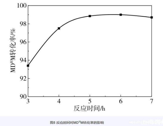 在n(BEO)∶n(MDHM)为1.05∶1、三氯化钌催化剂的用量为30 mg/kg、反应温度100℃的条件下,考察反应时间对MDHM转化率的影响,结果如图5所示。由图5可知,随着反应时间的增加,MDHM转化率逐渐增大,当反应时间为6.0 h时转化率最大,继续增加反应时间MDHM转化率没有提高,并且增加了生产成本及能源消耗。因此,本文确定适宜的反应时间为6.0 h。