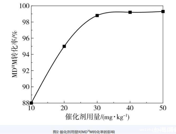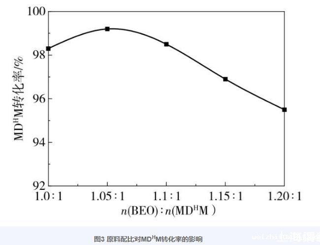 在n(BEO)∶n(MDHM)为1.05∶1、三氯化钌催化剂的用量为30 mg/kg、反应时间6.0 h的条件下,考察反应温度对MDHM转化率的影响,结果如图4所示。可以看出,MDHM转化率随温度的升高而增大,这主要是因为Si—H键的反应活度受温度影响,温度越高越有利于其断裂。温度为100℃的MDHM转化率(99.05%)相较90℃的MDHM转化率(98.6%)仅提高了0.45%,提升幅度很小,这是因为反应温度过高会使催化剂的催化效率降低,产物颜色加深,但考虑到MDHM转化率须大于等于99%,因此本文确定适宜的反应温度为100℃。