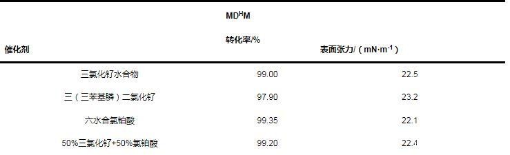 分别以三氯化钌、三(三苯基膦)二氯化钌、六水合氯铂酸和50%三氯化钌+50%氯铂酸为催化剂,在以下条件下合成BEOTSS:催化剂用量30 mg/kg(以Ru或Pt质量计),n(BEO)∶n(MDHM)=1.05∶1,反应时间6.0 h,反应温度100℃。测定MDHM转化率以及0.1%BEOTSS水溶液的表面张力,结果如表1所示。可以看出,这几种催化剂的效果均较好,MDHM转化率在97%以上,表面张力低于24 mN/m。其中,三氯化钌的催化效果与传统的氯铂酸相差不大,只是所得产物为黄色液体,比氯铂酸的产物颜色深。考虑到三氯化钌价格比氯铂酸便宜很多,因此采用三氯化钌作为催化剂具有很好的成本优势。