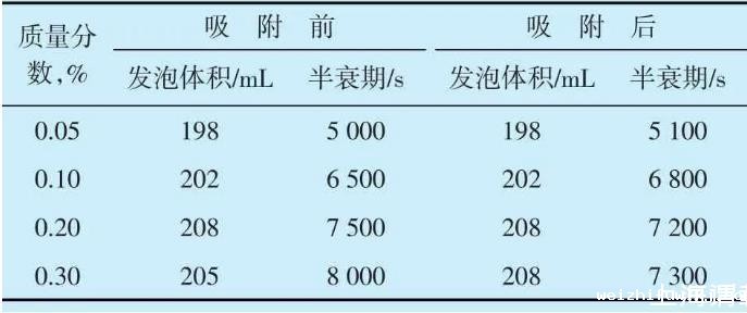 配制质量分数为0.05%,0.10%,0.20%和0.30%的磺基甜菜碱泡沫剂,再分别充入纯度为99.9%的氮气,利用罗氏泡沫仪测试氮气泡沫体系吸附前后的泡沫性能。评价结果(表1)表明,当温度为80℃时,不同质量分数的氮气泡沫体系在吸附前后发泡体积均保持在200 mL左右,半衰期大于5 000 s,表明均具有良好的起泡性能和稳定性能。