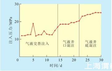 在气液井底混合注入阶段,当气液比为0.75∶1时,1 d后注入压力由气液井口混合注入阶段末期的20.3 MPa上升到22.9 MPa;当气液比升至1∶1,注入压力进一步升至25 MPa。
