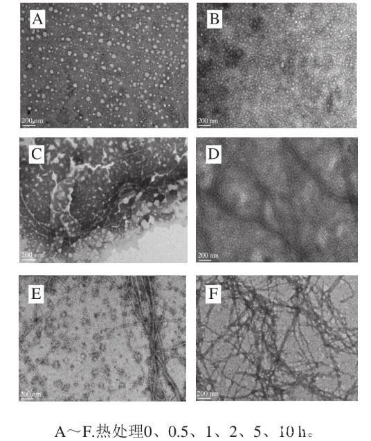 图2加热不同时间形成的β-乳球蛋白纳米纤维的透射电子显微镜图