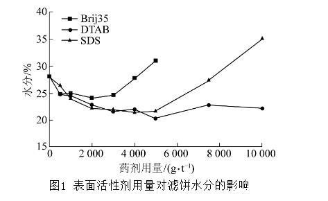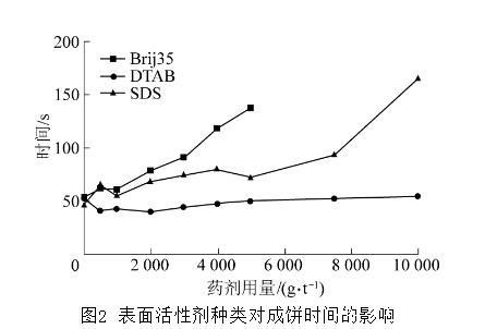 过滤过程中,成饼速率与脱水速率成正比,成饼速率越快,过滤时间越短。从图2可以看出,Brij35和SDS两种药剂的成饼时间均随药剂量的增加而增加,Brij35的增加最为迅速,在用量为4 000 g/t时从不添加药剂时的55 s上升至137 s,SDS在达到最佳药剂量之前成饼时间变化并不明显,但在超过最佳药剂量后,成饼时间迅速上升。DTAB能略微减少成饼时间,在最佳用量时成饼时间从不添加药剂时的55 s减少到50 s。