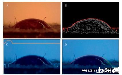 A.显微镜拍摄的叶面测试液滴B.用Canny算法进行边缘检测(红色线为提取的轮廓曲线)C.轮廓拟合(黄色线为去除干扰后的轮廓曲线)D.确定并测定接触角(红色线为优化后的轮廓曲线,右侧两条绿色线的夹角即为接触角θ)。放大倍数为1 000倍