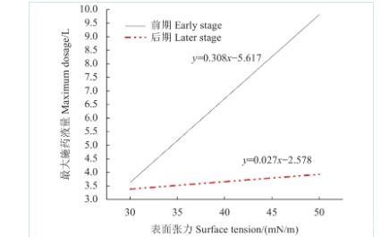 图8为估算出的苹果树叶片分别在生长前期和后期施药的最大药液量与药液表面张力的关系。从中可以看出,在试验果园中,在苹果树生长前期施药的最大施用量受药液表面张力的影响大于在生长后期施药。