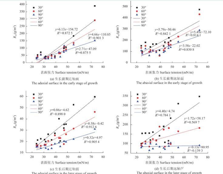 由表2结果可知,苹果叶片生长前期近、远轴面和生长后期近轴面,不同叶倾角下表面张力与Rm值拟合曲线的R2均高于0.80。而苹果叶片生长后期远轴面除30°时R2高于0.7外,其他叶倾角下均低于0.6,且随着叶倾角增大,R2不断减小,这表明苹果叶片生长后期远轴面的表面张力与Rm值之间的线性关系较差。