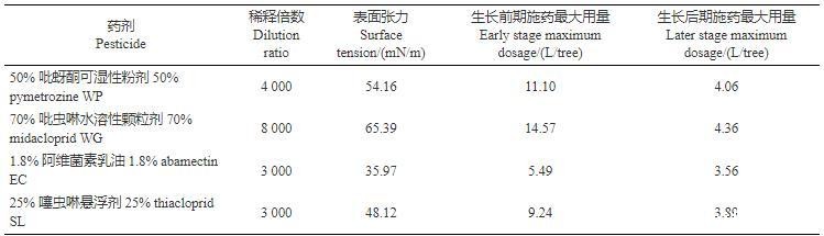 表3为4种常用农药制剂在推荐使用倍数下对苹果树的最大施药量。从表中可以看出,在苹果树生长前期施药的最大用量远高于在生长后期施药。考虑到目前果园中使用的大容量喷雾器械多为手持柱塞泵式机动喷雾机,雾滴粒径均一性较差,加之人为因素可能导致的药液无法均匀覆盖全树,再结合张鹏九等在关于不同药械防治苹果园桃小食心虫影响的研究中每株树推荐使用药液量为3.5 L,得出在果树前期推荐药液的表面张力应在35 mN/m以下,后期应在60 mN/m以上,便于实际操作。