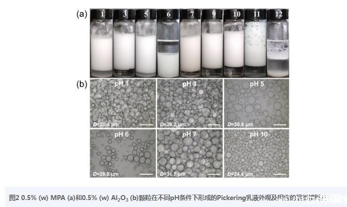 图20.5%(w)MPA(a)和0.5%(w)Al2O3(b)颗粒在不同pH条件下形成的Pickering乳液外观及相应的显微镜图片