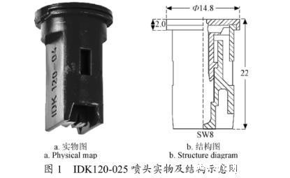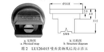 试验喷头为德国LECHLER公司生产的空气诱导喷头IDK120-025和多量程平面喷头LU120-015,其结构及尺寸如图1和图2所示。