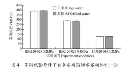 图4不同试验条件下自来水与蒸馏水雾滴体积中径