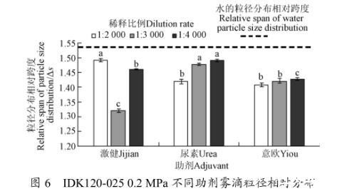此试验条件下自来水的粒径相对分布跨度为1.544。3种助剂溶液雾滴粒径相对分布跨度Δ受溶液配比因素影响程度不同。激健溶液1:3 000配比条件下对雾滴粒径相对分布跨度影响最为显著,为1.320,与水相比减小14.50%,明显优于该条件下其他各组数据。与尿素相比,意欧助剂在各浓度比例下对雾滴粒径相对分布影响保持在降低8%左右,改善效果更优,且受浓度变化影响小。