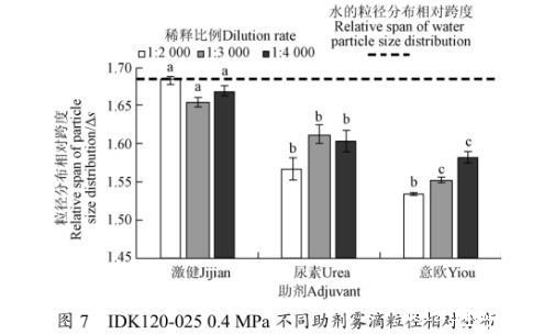 3)IDK120-025型喷头,0.4 MPa压力下。激健在配比1:3 000条件下,相比于自来水雾滴体积中径增大20.43%,雾滴粒径相对分布跨度减小1.74%。尿素与意欧溶液在配比1:2 000条件下,相比于自来水雾滴体积中径分别增大16.92%、11.10%,雾滴粒径相对分布跨度分别减小6.92%、8.86%,在增大雾滴体积中径的同时有效改善雾滴分布质量,增大雾滴飘移可控性。