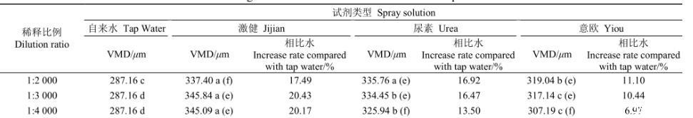 表3为雾滴体积中径试验结果,结果显示,与水相比,3种助剂均呈现增大雾滴体积中径趋势。激健助剂在1:2 000稀释比例下溶液与其余2种配比溶液之间存在显著性差异。尿素与意欧助剂在1:4 000稀释比例下溶液与其余2种配比溶液之间对应存在显著性差异。此结果说明,3种助剂在与水混合后雾化效果相对稳定。不同稀释比例下,激健溶液与水相比雾滴体积中径增大17%~20%,尿素溶液增大13%~17%,意欧溶液增大7%~11%。尿素与意欧溶液对雾滴体积中径影响均呈现随溶液浓度降低影响效果减弱趋势。