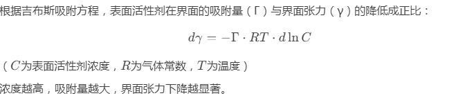 根据吉布斯吸附方程,表面活性剂在界面的吸附量(Γ)与界面张力(γ)的降低成正比: