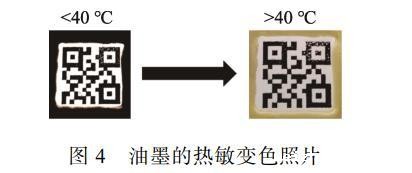 进一步探索通用油墨功能化的可能性。在通用油墨的配方中引入热敏黑材料,以检验其热变色防伪性能。如图4所示,二维码的黑色边框采用热敏黑复合通用油墨。当温度>40℃时,中间的普通商用油墨颜色保持不变,而热敏黑复合通用油墨边框则逐渐变为淡黄色。