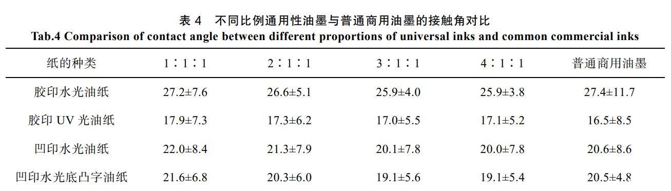 表4为各种比例的通用性油墨与普通商用油墨的接触角对比。由表4可知,乙氧基官能团的增加对接触角的大小变化和稳定性都有一定程度的改善,配比达到3∶1∶1后接触角几乎没有变化。以3∶1∶1配比的通用油墨为例,这款油墨在不同承印纸张上的接触角变化相比普通商用油墨有显著的减小,对不同承印纸张的浸润性也十分相近,从而大大增强了其通用性。