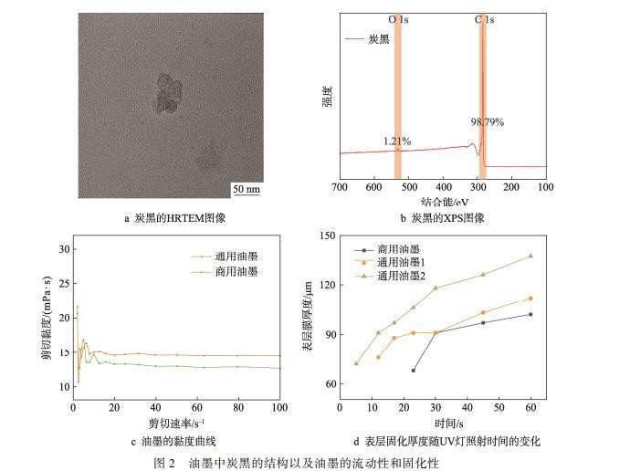 在制备油墨时,需关注黏度、分散稳定性和固化速度,确保喷码顺利。炭黑是关键组分,为避免炭黑团聚导致稳定性下降和打印堵塞,选择粒径适中的炭黑。粒径过小易团聚,过大可能堵塞,所选炭黑粒径在50 nm左右,HRTEM图像如图2a所示。对所选炭黑进行XPS分析,发现其氧含量高达1.2%,如图2b所示。这一特性有望改善炭黑与油墨中极性液体的相互作用,从而进一步提升油墨的稳定性。炭黑的良好分散性不仅有助于提高油墨的稳定性,还有助于降低油墨的黏度。如图2c所示,通用油墨的黏度降至13.0 mPa·s,相比商用油墨的15.5 mPa·s下降约17%,黏度的降低更有利于喷墨打印的流畅进行。