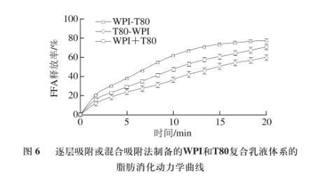 由图6可知,采用WPI乳化均质再添加T80吸附的乳液(WPI-T80),其消化速率和FFA释放程度最大,其次是将WPI和T80混合后乳化均质制备的乳液(WPI+T80),T80乳化均质再添加WPI吸附的乳液(T80-WPI)消化速率最慢。