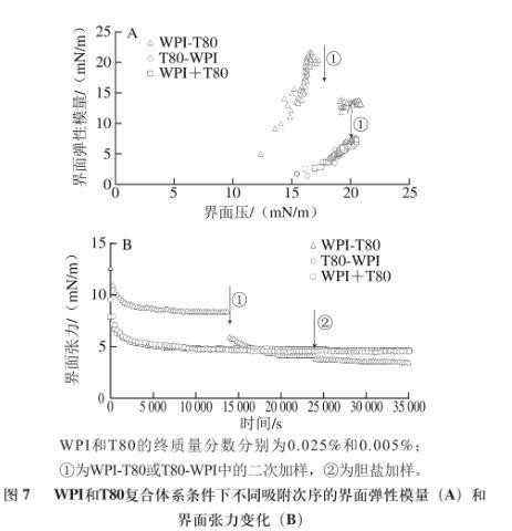 图7 WPI和T80复合体系条件下不同吸附次序的界面弹性模量(A)和界面张力变化(B)