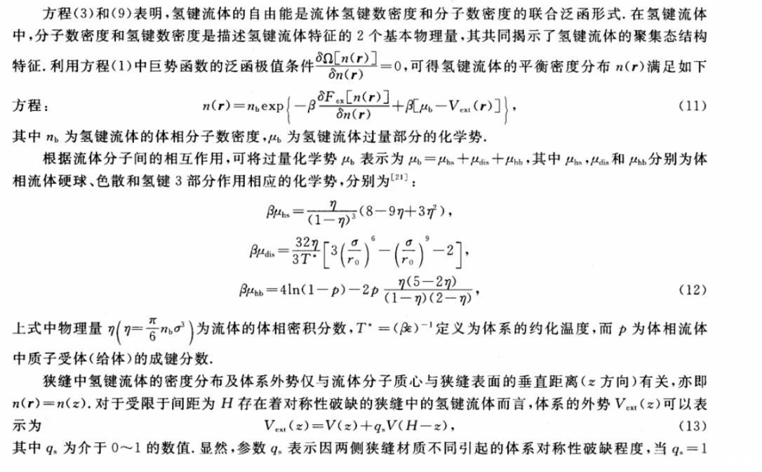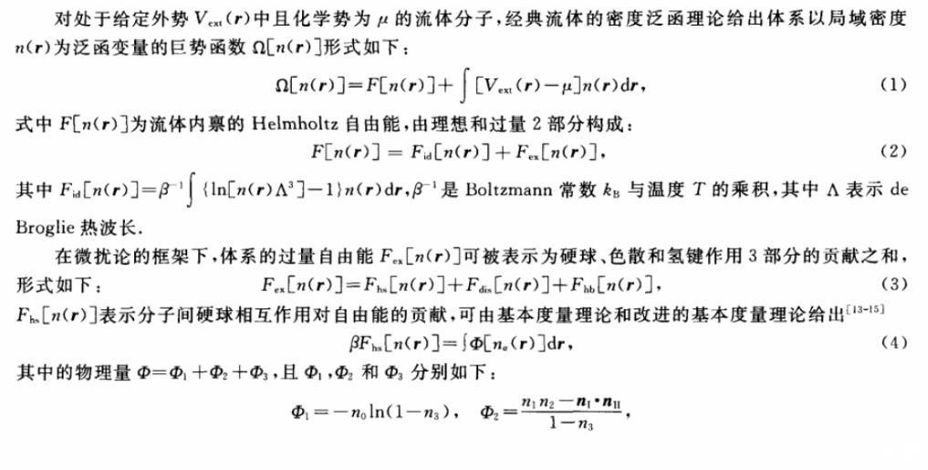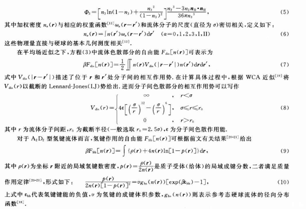 在微扰论的框架下,体系的过量自由能Fex[n(r)]可被表示为硬球、色散和氢键作用3部分的贡献之和,形式如下: