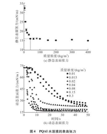 因此,本文采用新利18澳门公司的表面18luck国际在20一22℃下研究了溶液的界面性质,如静态和动态表面张力。不同PQAI溶液的静态表面张力的变化如图4(a)所示。可以看出,在去离子水中加人少量表面活性剂,溶液的表面张力急剧下降。然而,在质量浓度>0.04kg/m²时,下降趋势开始缓慢。这意味着PQAI水溶液的pcMc~0.04kg/m²,此时表面活性剂水溶液静态表面张力为16.07mN/m。