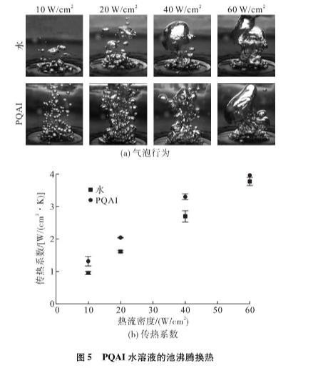 本文研究了PQAI溶液的池核沸腾换热特性,试验台参数参考文献。图5显示了PQAI溶液在临界胶束浓度下的沸腾传热性能。与水相比,由于PQAI水溶液中表面张力的降低,沸腾时产生的气泡数量显著增加,气泡半径减小。此外,在低热流密度下,可以明显观察到在气泡脱离时气泡聚结的趋势减小,并且气泡的形状更接近球形。表面活性剂分子由极性亲水头和疏水性长尾组成。