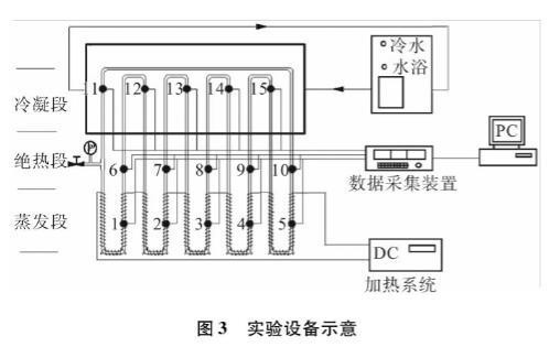 脉动热管由外径4 mm、内径2 mm,经氧乙炔正火处理后铜毛细管弯曲而成。图3示出了脉动热管实验设备的示意图。用误差传播法分析了实验装置的不确定性。电压电流精度为1%。本文中最小电压和电流分别为17.9V和1.7A。此外,热电偶的不确定度为0.1℃。在蒸发器和冷凝器的最小温差为45℃时,热阻的最大相对不确定度为4.47%。