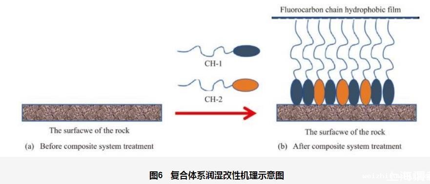 由图5可看出,随着表面活性剂浓度的增加,3种体系对应的接触角均先增大后降低最终趋于平衡;阳-非离子复合表面活性剂体系的润湿改性效果最好,可使模拟地层水在石英片表面上的接触角由23.0°增至108.0°,使凝析油在石英片表面上的接触角由36.0°增至102.0°;石英片经CH-1或CH-2处理后,模拟地层水在石英片表面的最大接触角分别为101.8°或97.7°,凝析油在石英片表面的最大接触角分别为97.2°或94.5°。这是因为阳离子表面活性剂分子与非离子表面活性剂分子间存在复配协同效应。图6为复合表面活性剂体系润湿改性机理示意图。由图6可看出,阳离子表面活性剂分子与非离子表面活性剂分子构成的混合聚集体与砂岩表面羧酸类物质形成离子对的驱动力为静电引力、氢键、范德华力的共同作用力,作用效果远大于单一的静电引力、氢键及范德华力。这些共同作用力使复合表面活性剂在界面上的吸附能力通常比单一表面活性剂更强。阳离子表面活性剂和非离子表面活性剂可同时或交替地吸附在固体表面,形成更紧密、更稳定的吸附层,这种吸附层可以改变固体表面的性质,使其更疏水疏油。