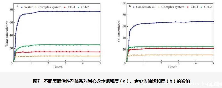 经3种体系处理后,岩心的含水饱和度均降低,经CH-1和CH-2处理过的岩心含水饱和度分别降至14.64%和25.79%,而经阳-非离子复合表面活性剂体系处理后,岩心含水饱和度由77.4%降至8.10%。由图7b可看出,未被表面活性剂处理的岩心在自发渗吸时间为0.5 h时,岩心自发渗吸达到饱和,此时岩心含油饱和度增至68.90%。岩心经3种体系处理后,岩心的含油饱和度均降低,经CH-1和CH-2处理过的岩心含油饱和度分别降至22.29%和25.53%,而经阳-非离子复合表面活性剂体系处理后,岩心含油饱和度降至11.25%。