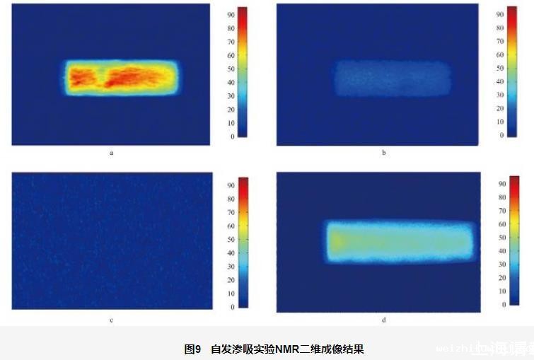 NMR通过快速傅里叶变换和图像重建生成岩样的二维图像,可直观展示流体在岩心内部的分布。图9为自发渗吸实验NMR二维成像结果,纵坐标表示氢信号的强度(即水或油的含量高低),数字越大表示氢信号强度越强。图中由红色到绿色、浅蓝再到深蓝,表示信号由强变弱,也代表了含水(氢)量从高到低的变化过程。由图9可看出,原始岩心烘干后呈深蓝色,自发渗吸后呈红绿色,经复合表面活性剂体系处理后的岩心自发渗吸后呈浅蓝色和绿色;经过复合表面活性剂体系处理后,岩心含水/油饱和度大幅降低,复合表面活性剂体系降低了液体的表面张力,削弱了毛细管力;岩心孔隙的润湿性由亲水亲油反转为疏水疏油,水相在毛细管内的状态由驱替相转变为非驱替相,地层水/凝析油不易吸附于岩心孔隙内,表面张力的降低和岩石孔隙表面的润湿性改变可明显改善流体在多孔介质内的流动状况,进而达到预防液侵的目的,这与岩心自发渗吸实验和NMR T2谱曲线分析结果相符。