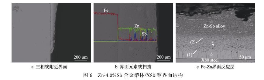 为进一步探究Sb元素分布对锌合金熔体与X80钢润湿性的影响,将样品沿截面剖开,进行界面结构观察,图6a为三相线(Triple line)附近界面,界面区域线扫描结果如图6b所示。线扫描结果显示界面处仅含有少量Sb,元素Sb主要在锌液表面及内部富集。这是因为Sb的原子半径要大于Zn,意味着其原子体积大于Zn的原子体积,因此总是倾向于被排挤到锌液表面富集,从而降低锌液的表面张力,提高润湿性。