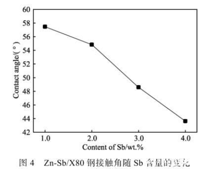 在实验过程中,锌合金熔体在基板上的润湿时间很短,润湿体系会很快达到平衡,且锌合金熔体中Sb元素的添加量很少,根据Fe-Sb二元相图可知,在450℃滴落温度下,Fe与Sb之间的固溶度极小并无化合物生成,与X80钢基板发生反应的元素主要是Zn,可以认为Sb添加对降低锌液与X80钢基体之间界面张力σsl的影响相对较小,由此Zn-Sb合金熔体与X80钢基板之间的润湿角主要取决于锌合金熔体的表面张力σlv,表面张力σlv越小,接触角越小,即锌合金熔体与X80基板之间的润湿性越好。