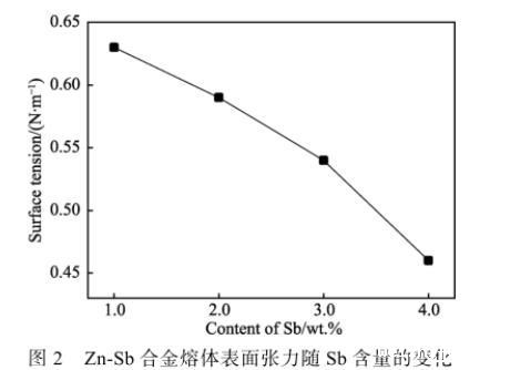1)Sb的添加能显著降低锌液表面张力,且合金熔体表面张力随Sb含量的增大而减小。当Sb质量分数为1.0%时,锌合金熔体表面张力为0.63 N/m;Sb质量分数增加到4.0%时,表面张力达到最小,约为0.46 N/m。