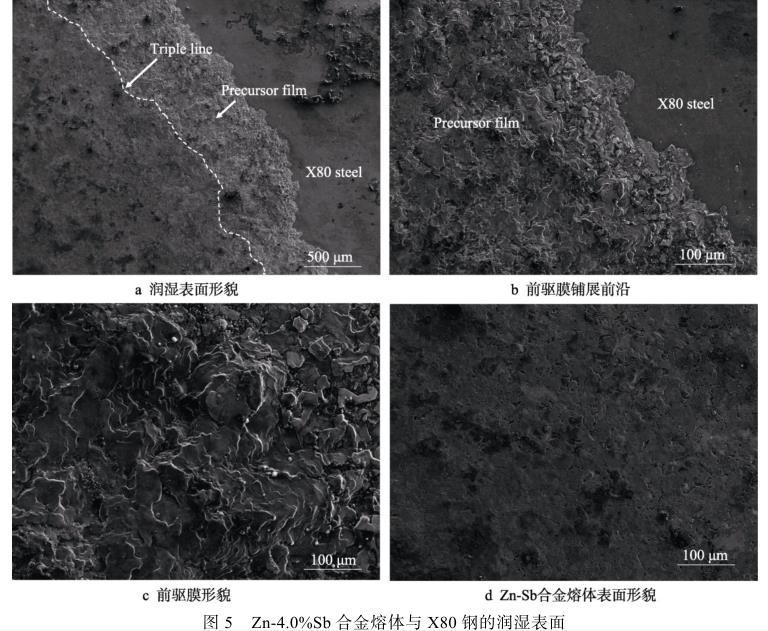 综上分析,Zn-Sb合金熔体润湿X80钢时,Sb作为表面活性元素在锌液表面富集,使其在界面反应过程中降低锌液表面张力,从而提高润湿性。在锌合金熔体与X80钢的反应三相线外形成前驱膜,前驱膜的存在使随后的锌合金熔体在其上铺展,进而促进润湿。