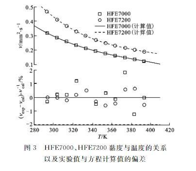 图3 HFE7000、HFE7200黏度与温度的关系以及实验值与方程计算值的偏差