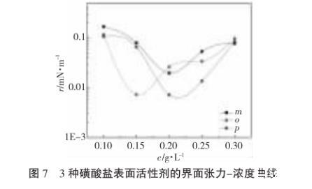 用旋滴界面18luck国际测定45℃下烷基二甲苯磺酸盐的界面张力。配制浓度分别为0.1,0.15,0.2,0.25,0.3g·L-1的3种磺酸盐表面活性剂的溶液。测定与大庆采油二厂原油的界面张力,其测定结果见图7。