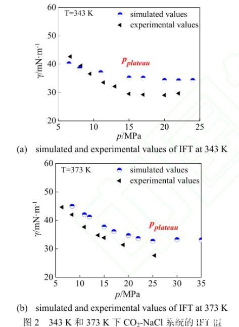 本文分别模拟了343 K和373 K的各压强下盐浓度为1.89 mol·L-1的CO2-NaCl系统,IFT的计算结果示于图2。由图2可以看出,模拟所得的IFT值与Chalbaud等的实验数据吻合较好。在温度为343 K时[图2(a)],IFT值随着压强的不断升高,其减幅逐渐下降,最终在压力平衡点pplateau=15 MPa之后达到稳定值34 mN·m-1。373 K时[图2(b)]的IFT值变化与343 K时极为相似,IFT值同样随着压强的升高而下降,且下降速度不断趋于平缓,由于高压情况下实验设备等因素受限制,实验方法尚未得到25 MPa以上的数据点,故在实验压强范围内并未观测到压力平衡点。而本文应用分子模拟的方法,成功模拟了25~35 MPa下的CO2-NaCl系统,观测到压强在pplateau=25 MPa之后达到稳定值33 mN·m-1。