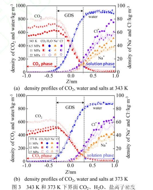 为从分子角度更加详细地描述界面性质的变化,本文选取并计算了界面处2 nm厚度区域的CO2、H2O、Na+及Cl-的密度,结果示于图3。由图3可以观测到:当从CO2相向溶液相过渡时,CO2密度逐渐下降,H2O密度则逐渐上升;而盐离子密度则从界面中心向溶液相,由0逐渐达到某一稳定值。由图3可以看出,温度一定时,CO2在CO2相的密度随着压强的升高逐渐升高。由[图3(a)]可以看出,温度为343 K时,当压强由6.5 MPa升高至22 MPa,CO2相的CO2密度从580 kg·m-3升高至800 kg·m-3左右;而温度为373 K时[图3(b)],当压强由11 MPa升高至17 MPa,CO2相的CO2密度从约420 kg·m-3升高至600 kg·m-3左右。此外,对比图3(a)和(b)还可知,当压强恒定在11 MPa时,温度由343 K升高到373 K,CO2相的CO2密度则由700 kg·m-3降至420 kg·m-3左右。