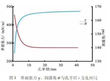 图1界面张力γ、润湿角θ与孔半径r变化曲线