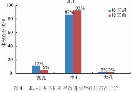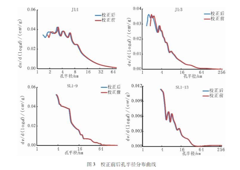 同样应用参数校正前后的Washburn方程对松辽盆地青山口组JL-1、JL-3、SL1-9、SL1-13井的泥页岩样品的数据处理、对比发现——参数校正后的方程对于半径为4 nm以下的孔有较大的影响,对于半径为4 nm以上的孔基本上没有影响(图3)。
