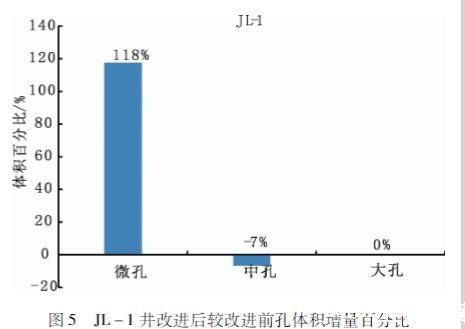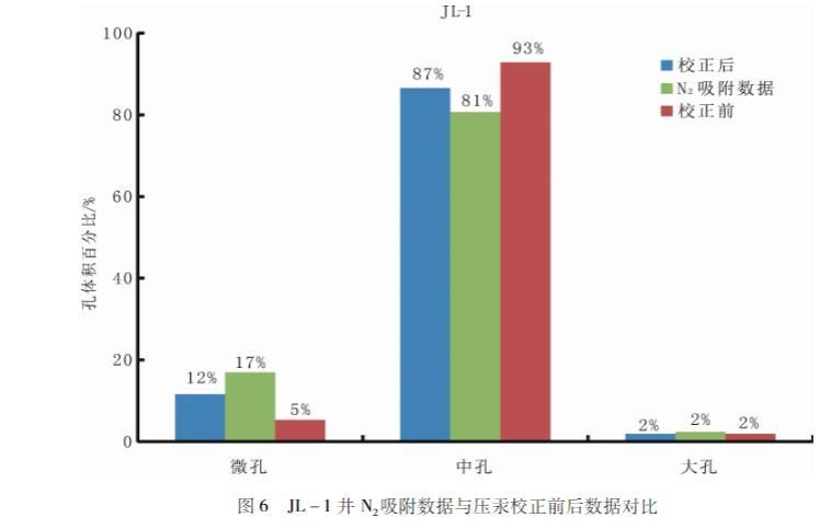 用参数校正后的方程处理数据发现样品微孔孔体积占比增加,较原始方程处理得到的结果增加了118%;而中孔孔体积占比减小,较原始方程处理得到的结果减小了7%;大孔孔体积占比不变。用改进后的Washburn方程对松辽盆地青山口组JL-1、JL-3、SL1-9、SL1-13井的泥页岩样品的数据处理得出:该地区主要以微孔、中孔为主,发育有小部分大孔。统计压汞实验数据发现微孔占比平均12%左右,中孔占比平均为86%,大孔占比平均为2%。依据实验数据评估,松辽盆地青山口组地区油气主要储集在中孔里面。因此,提高微小孔(<50 nm)烃源岩储集层的勘探开发有十分重要的意义。