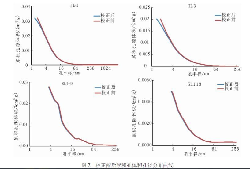 应用参数校正前后的Washburn方程对松辽盆地青山口组JL-1、JL-3、SL1-9、SL1-13井的泥页岩样品压汞数据处理得到累积孔体积的孔半径分布曲线,分析发现:参数校正后的方程对于微小孔的影响较大,在孔半径小于4 nm时,校正前后的两条曲线出现明显的不重合(图2)。